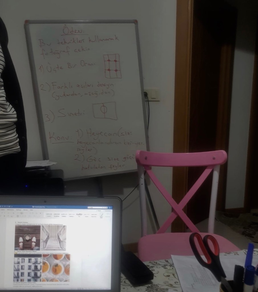 Based on the themes on which the participants wanted to produce images, the moderator Fulya Pinar provided photography trainings and homework. As the participants wanted to practice Turkish language with the moderator, trainings were provided in Turkish with constant code-switching between Turkish, English, and different dialects of Arabic.